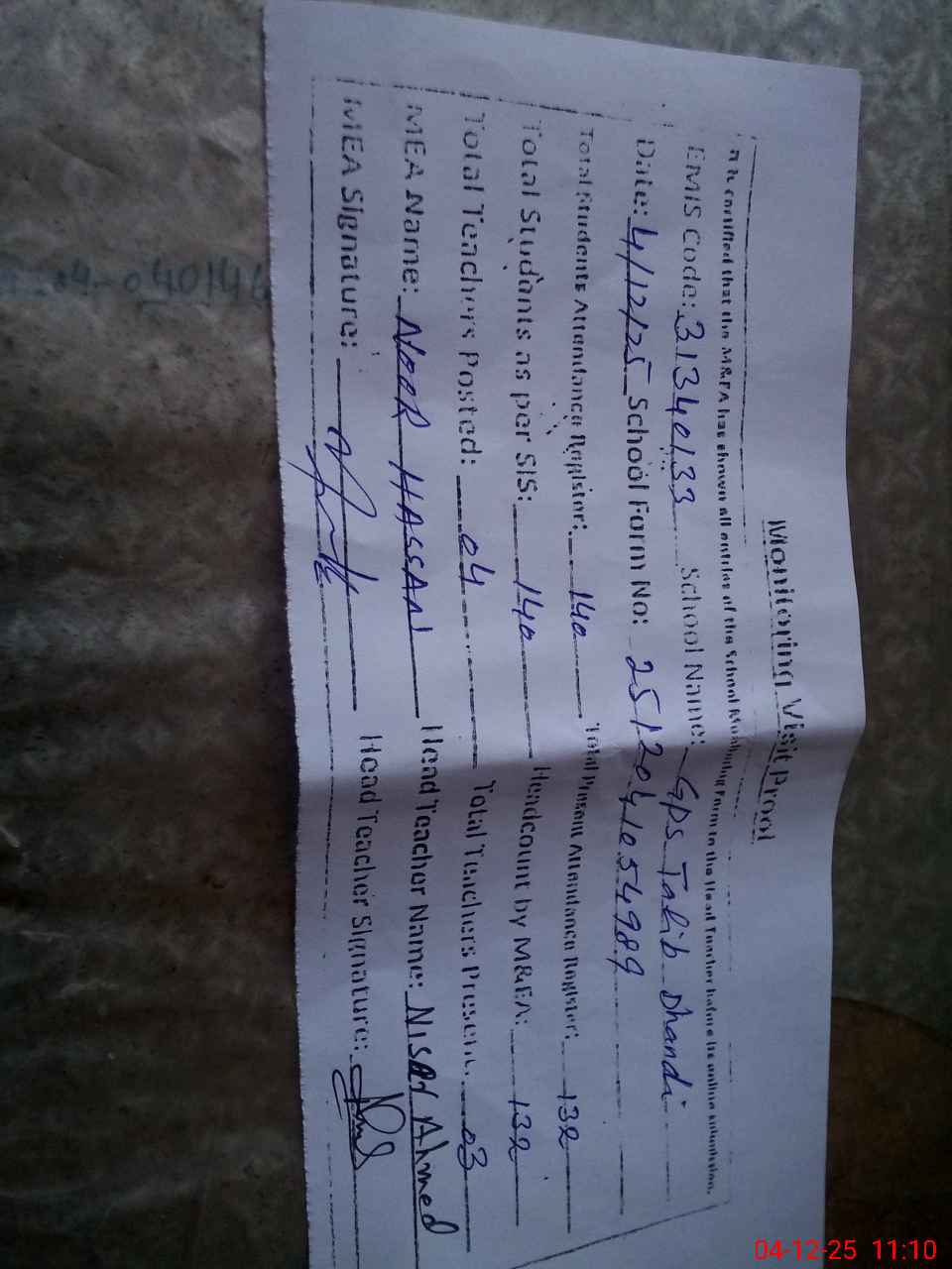 | Attendance Register | Head Teacher | MEA with School | Visit Proof |
