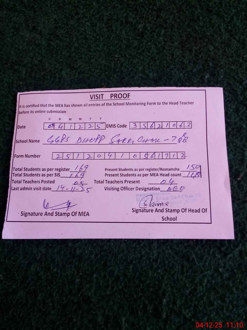 | Attendance Register | Head Teacher | MEA with School | Visit Proof |