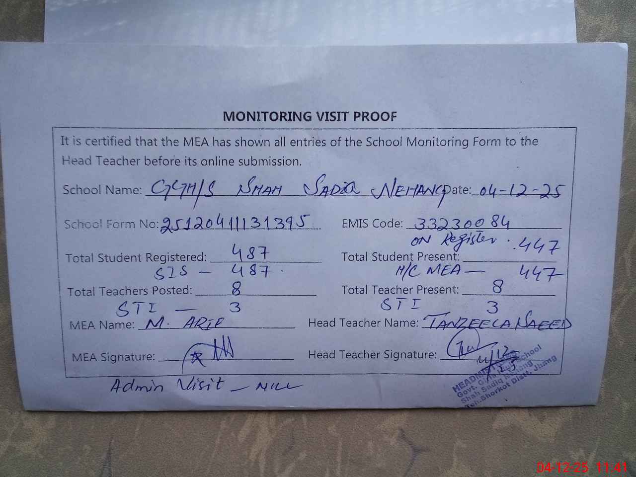 | Attendance Register | Head Teacher | MEA with School | Visit Proof |