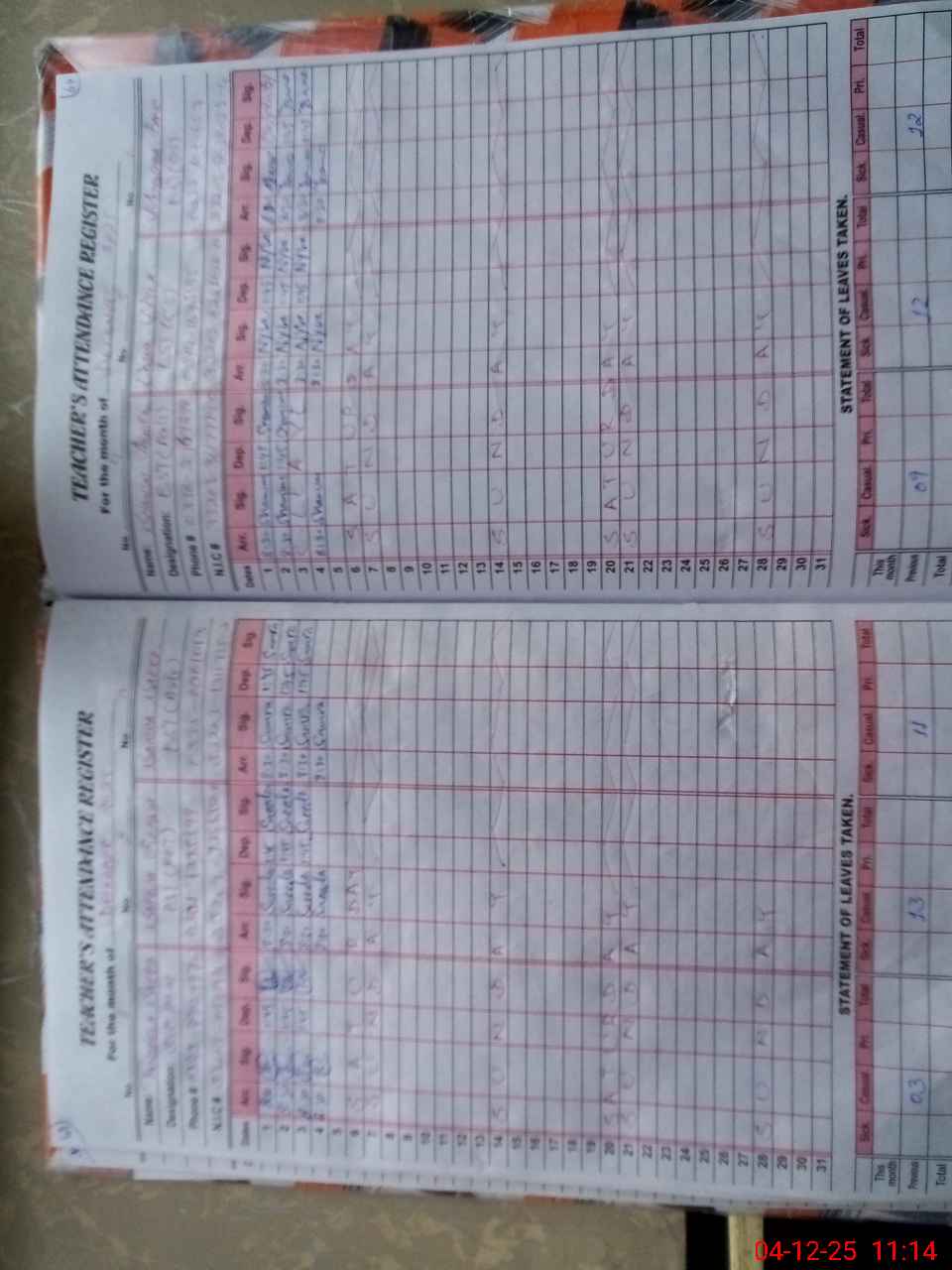 | CNIC | Full Name | Designation | R/C | Absence During Last Calender Month |