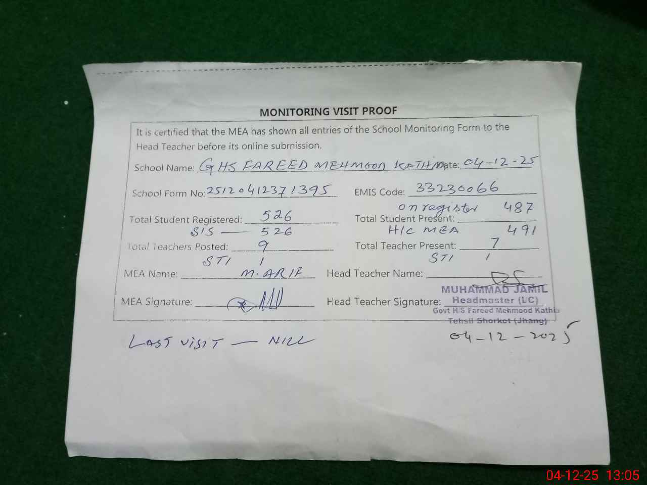 | Attendance Register | Head Teacher | MEA with School | Visit Proof |