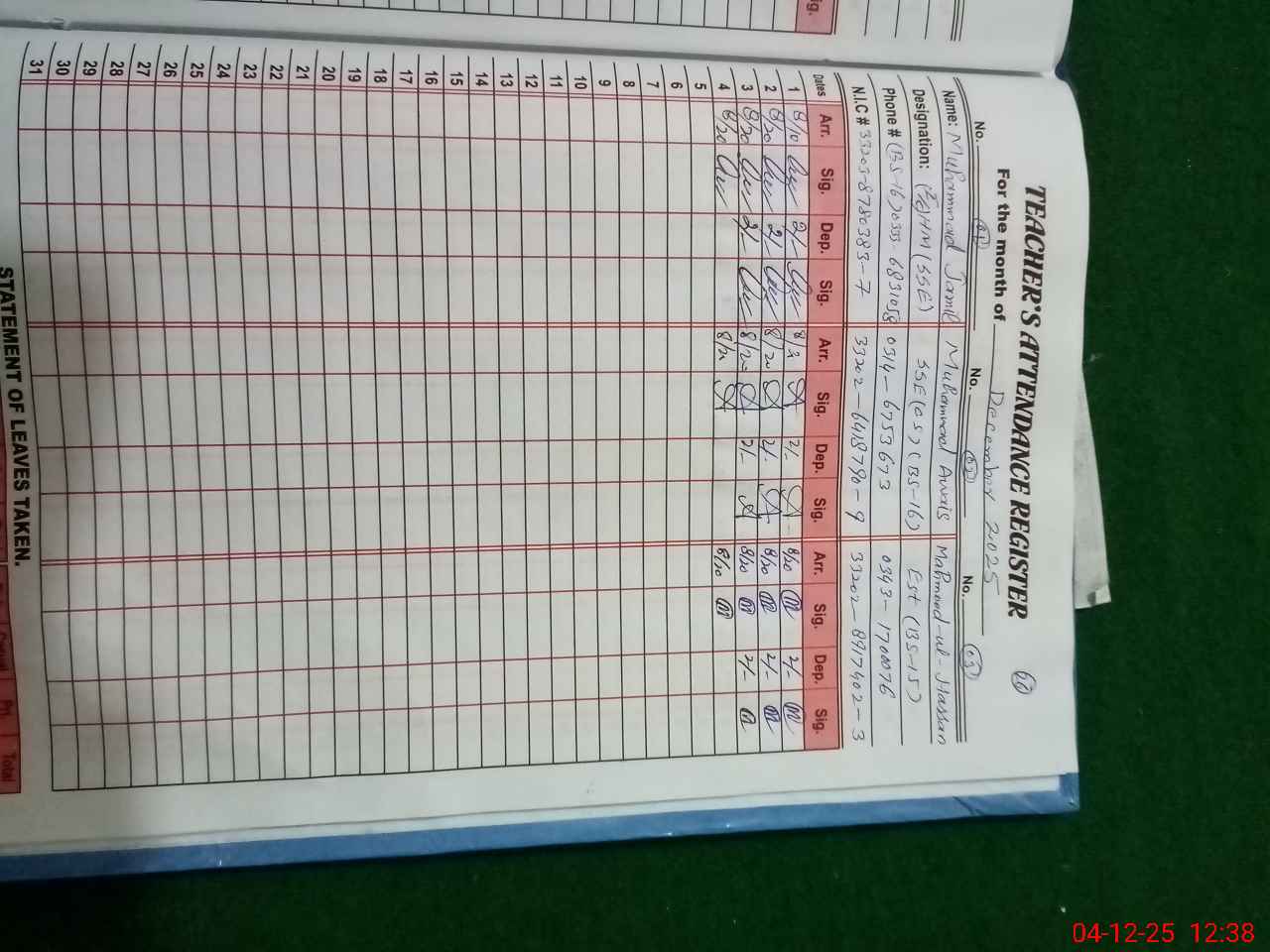 | CNIC | Full Name | Designation | R/C | Absence during last cal. month |