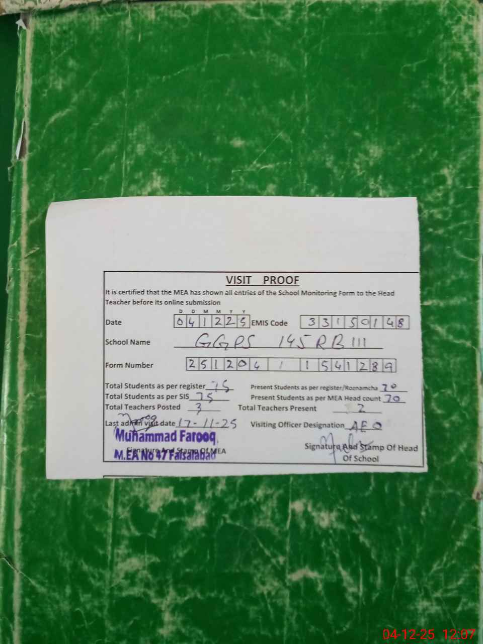 | Attendance Register | Head Teacher | MEA with School | Visit Proof |