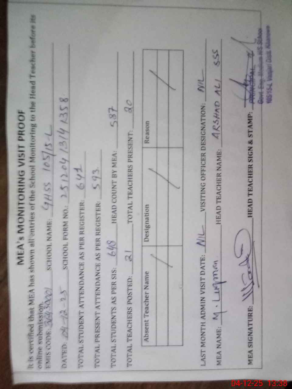 | Attendance Register | Head Teacher | MEA with School | Visit Proof |