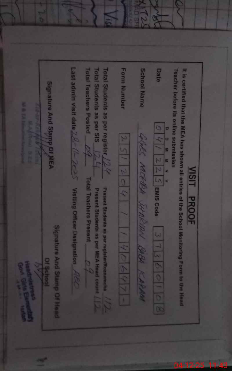 | Attendance Register | Head Teacher | MEA with School | Visit Proof |