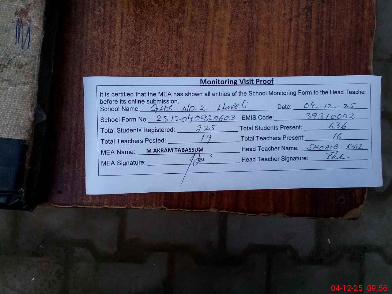 | Attendance Register | Head Teacher | MEA with School | Visit Proof |