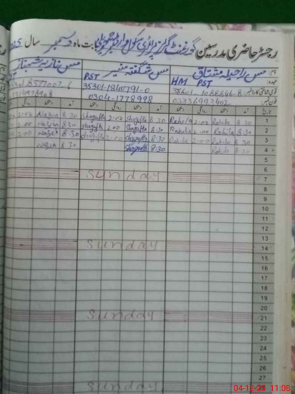 | CNIC | Full Name | Designation | R/C | Absence During Last Calender Month |