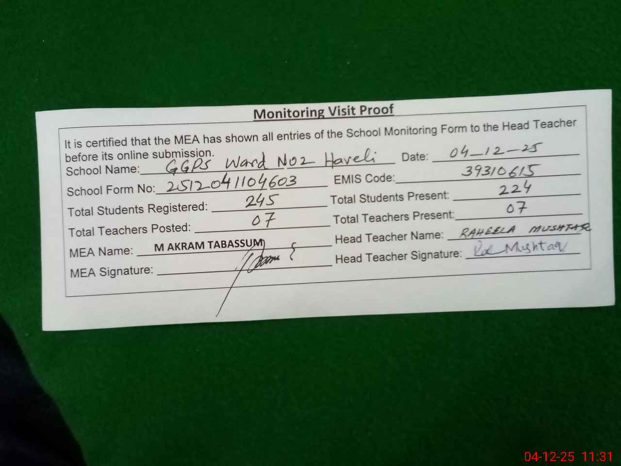 | Attendance Register | Head Teacher | MEA with School | Visit Proof |