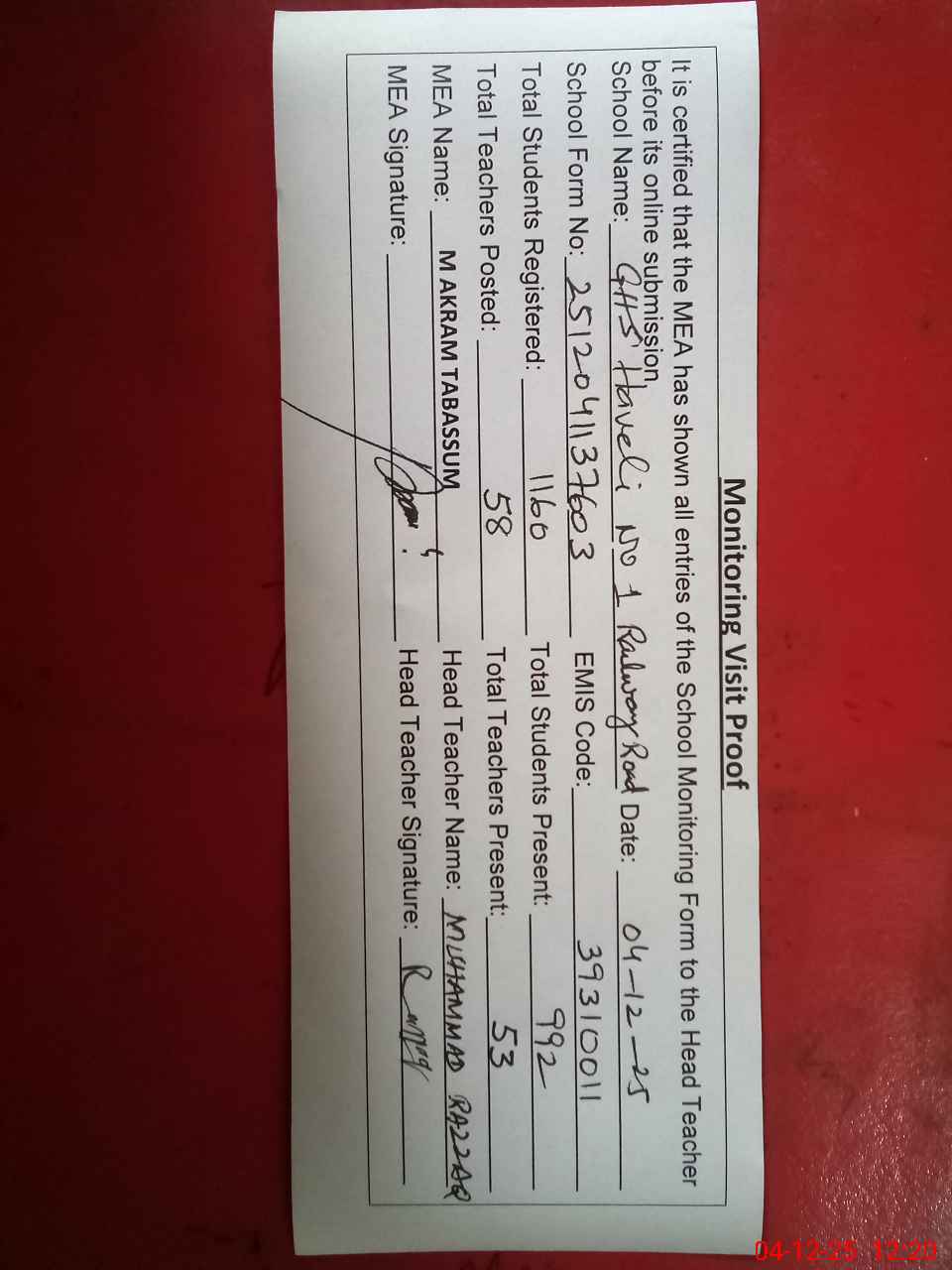 | Attendance Register | Head Teacher | MEA with School | Visit Proof |