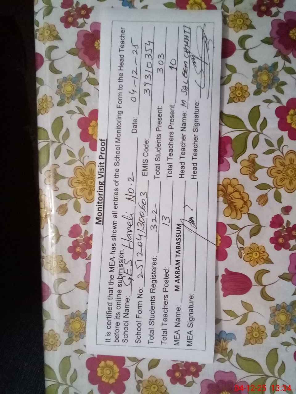 | Attendance Register | Head Teacher | MEA with School | Visit Proof |