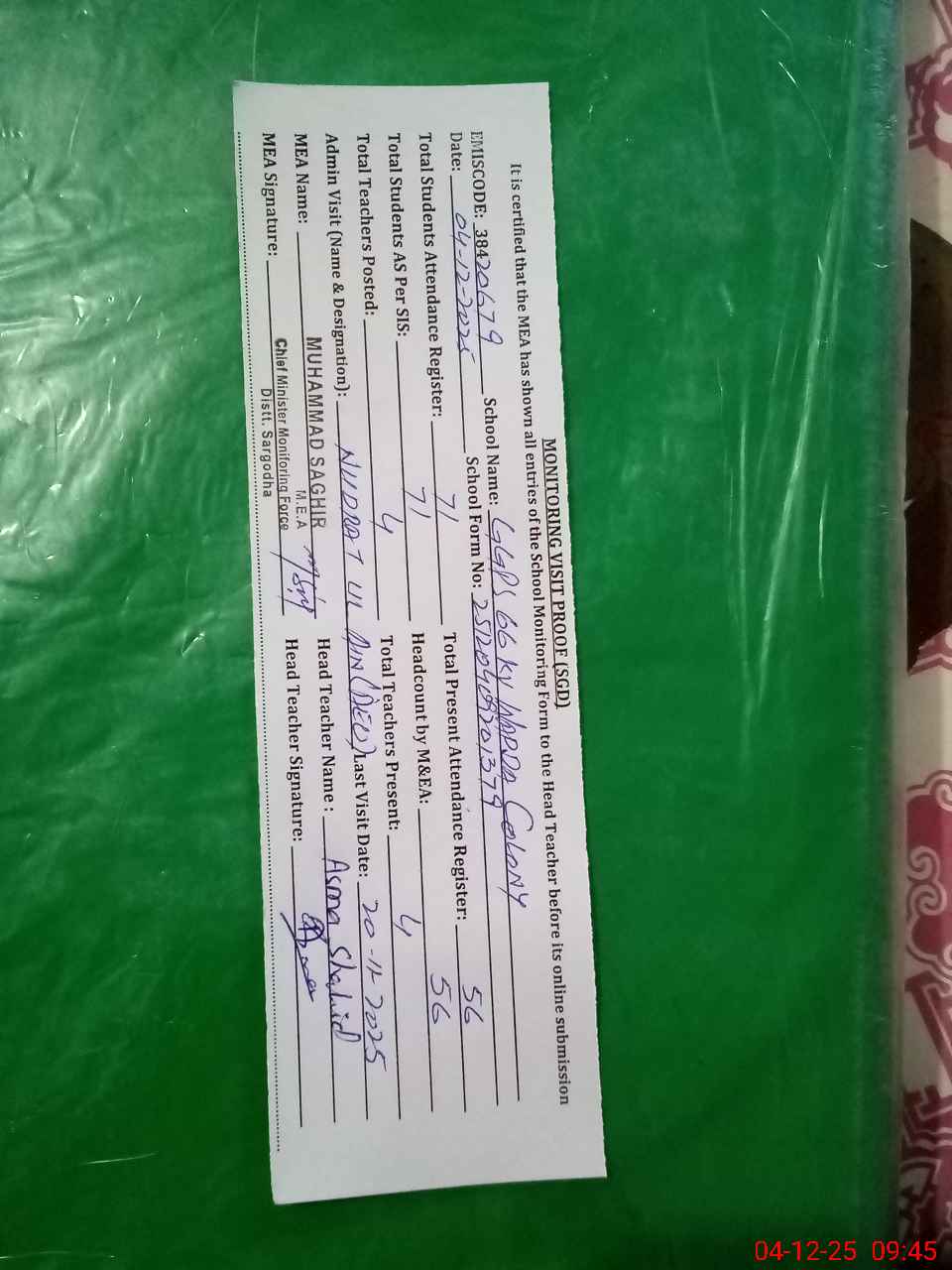 | EMIS Code: 38420679 | Name of School: GGPS 66 KV WAPDA COLONY | |||
