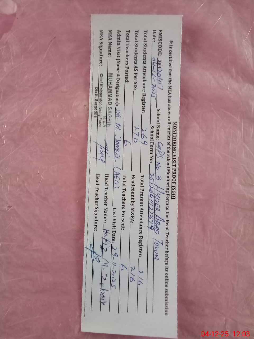 | EMIS Code: 38420417 | Name of School: GPS NO.3 HAYDER ABAD TOWN | |||