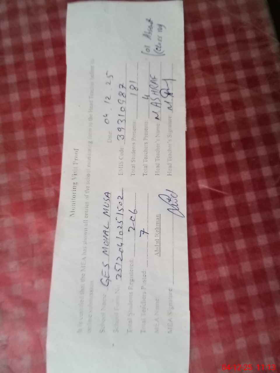 | Attendance Register | Head Teacher | MEA with School | Visit Proof |