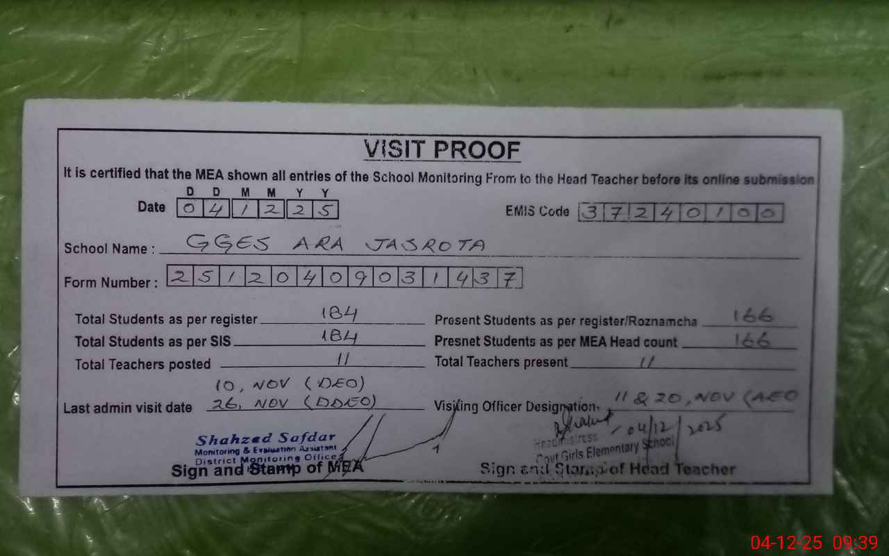 | EMIS Code: 37240100 | Name of School: GGES ARA JASROTA | |||