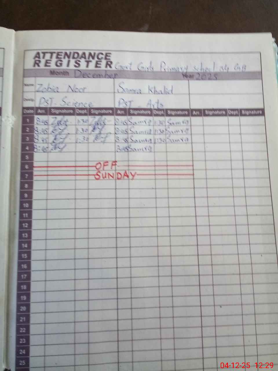 | CNIC | Full Name | Designation | R/C | Absence During Last Calender Month |