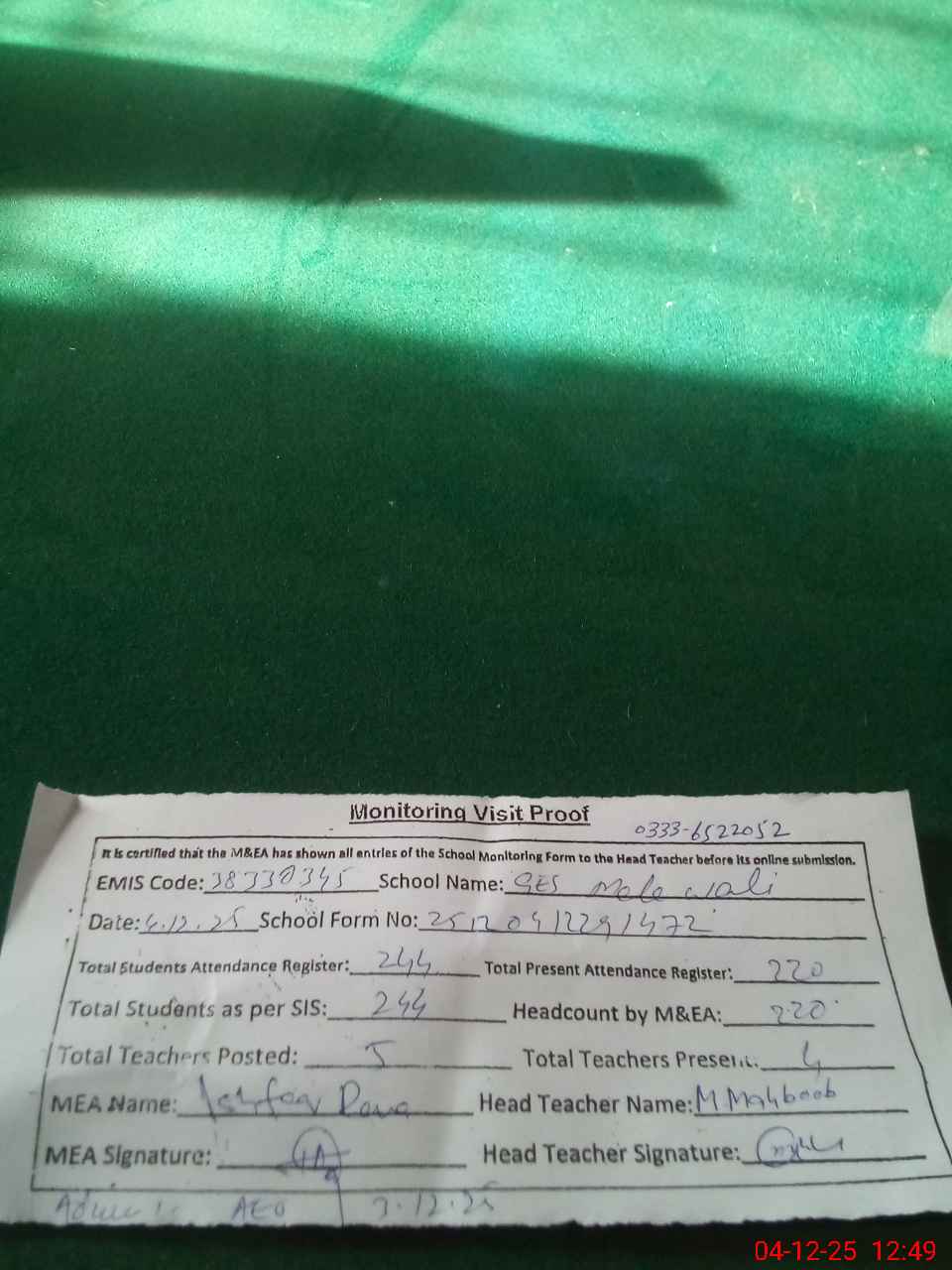 | Attendance Register | Head Teacher | MEA with School | Visit Proof |