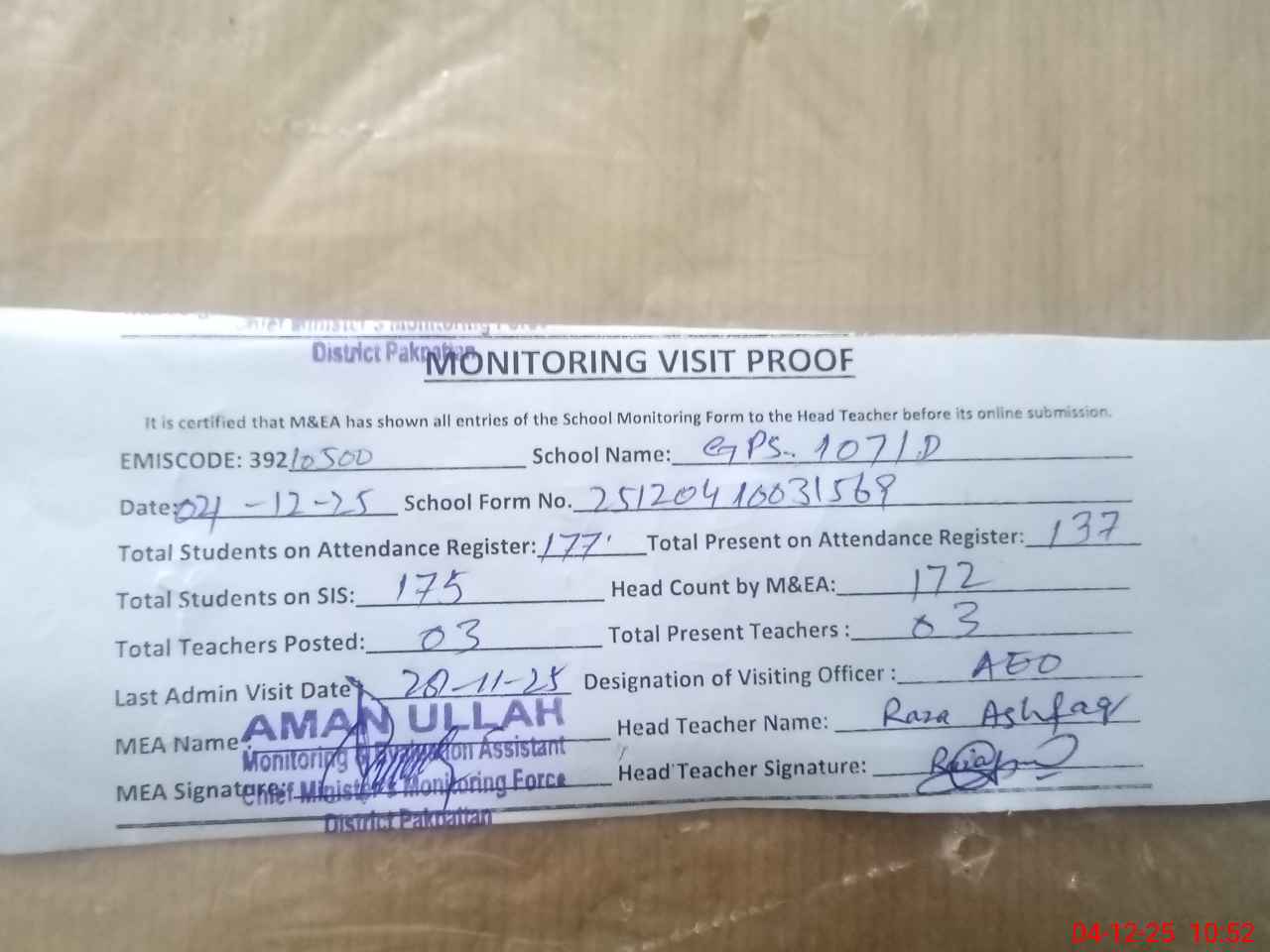 | EMIS Code: 39210500 | Name of School: GPS CHAK NO. 107 /D | |||