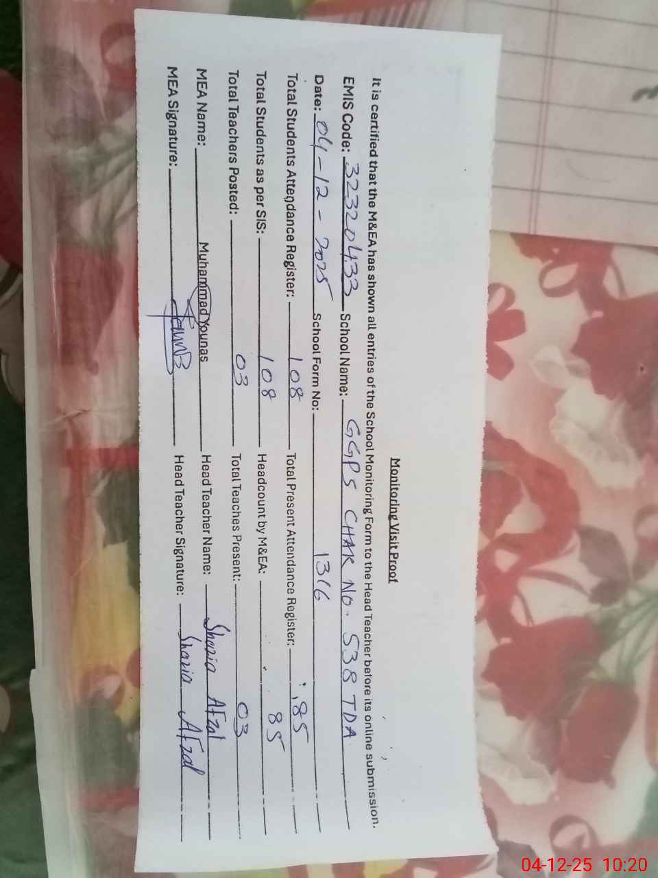 | EMIS Code: 32320433 | Name of School: GGPS CHAK NO. 538 TDA | |||