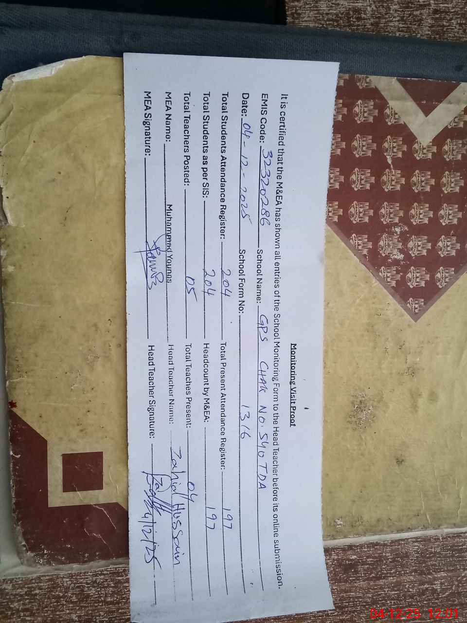 | Attendance Register | Head Teacher | MEA with School | Visit Proof |