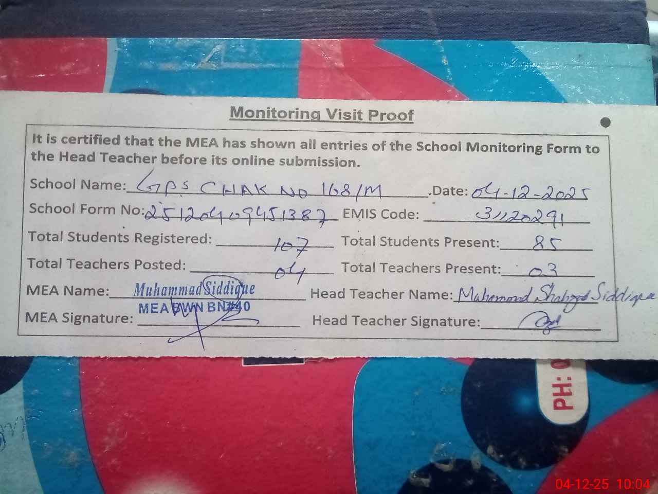 | EMIS Code: 31120291 | Name of School: GPS CHAK NO 168/M | |||