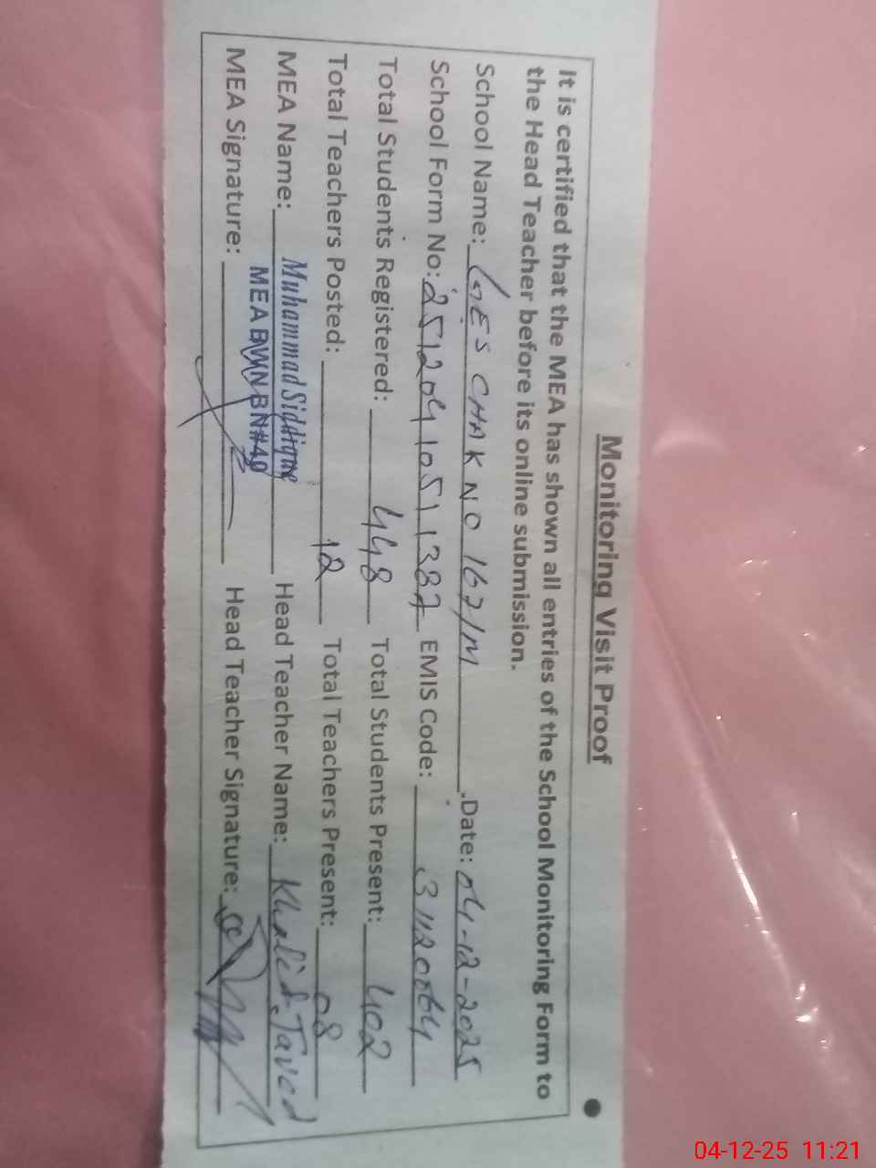 | Attendance Register | Head Teacher | MEA with School | Visit Proof |