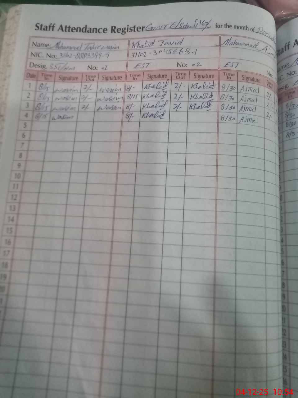 | CNIC | Full Name | Designation | R/C | Absence during last cal. month |