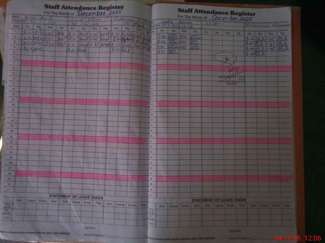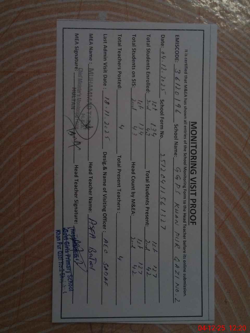 | Attendance Register | Head Teacher | MEA with School | Visit Proof |