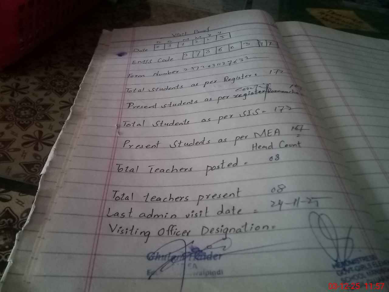 | Attendance Register | Head Teacher | MEA with School | Visit Proof |