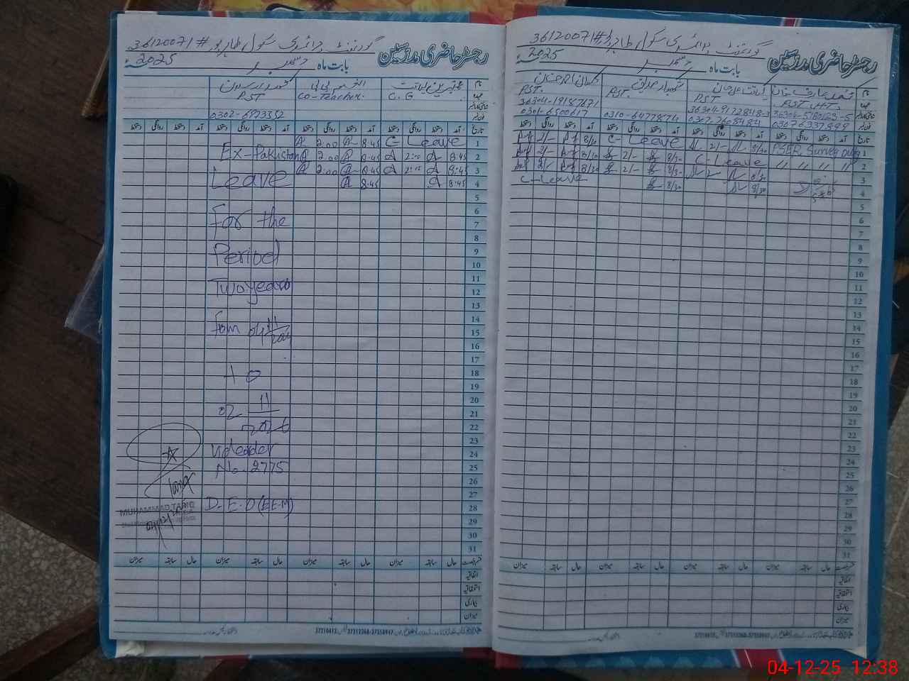 | Remarks (Use Separate Page if Required): Teachers attendance register stolen so AEO visit can't obtained. Afternoon shift students Attendence Registers not available SO students Attendence could not obtained. PST Hasan Ahmad Khan marked on casual leave but his sanctioned leave record not shown. | |||||