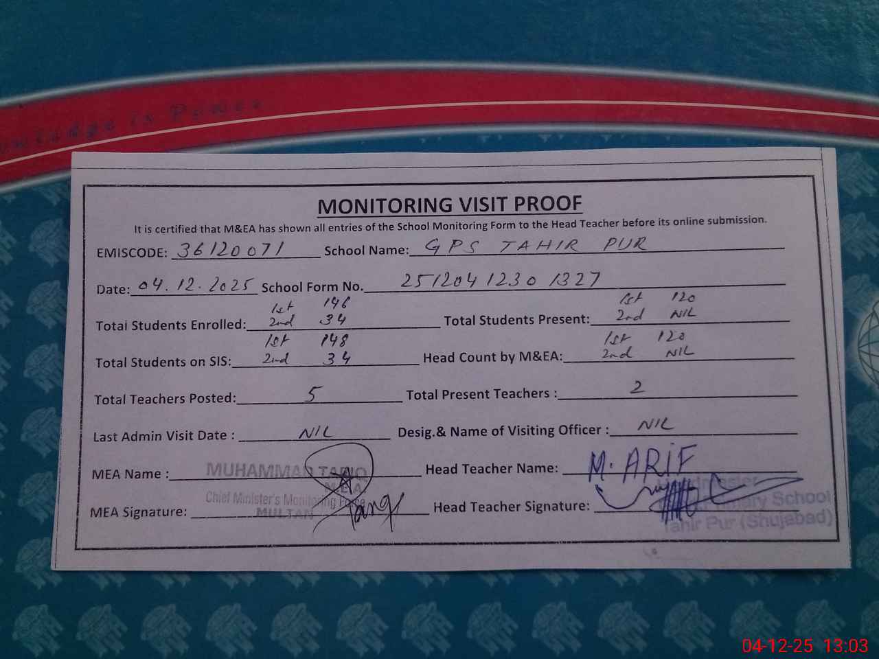 | EMIS Code: 36120071 | Name of School: GPS TAHIR PUR P/O & TEH.SHUJABAD | |||