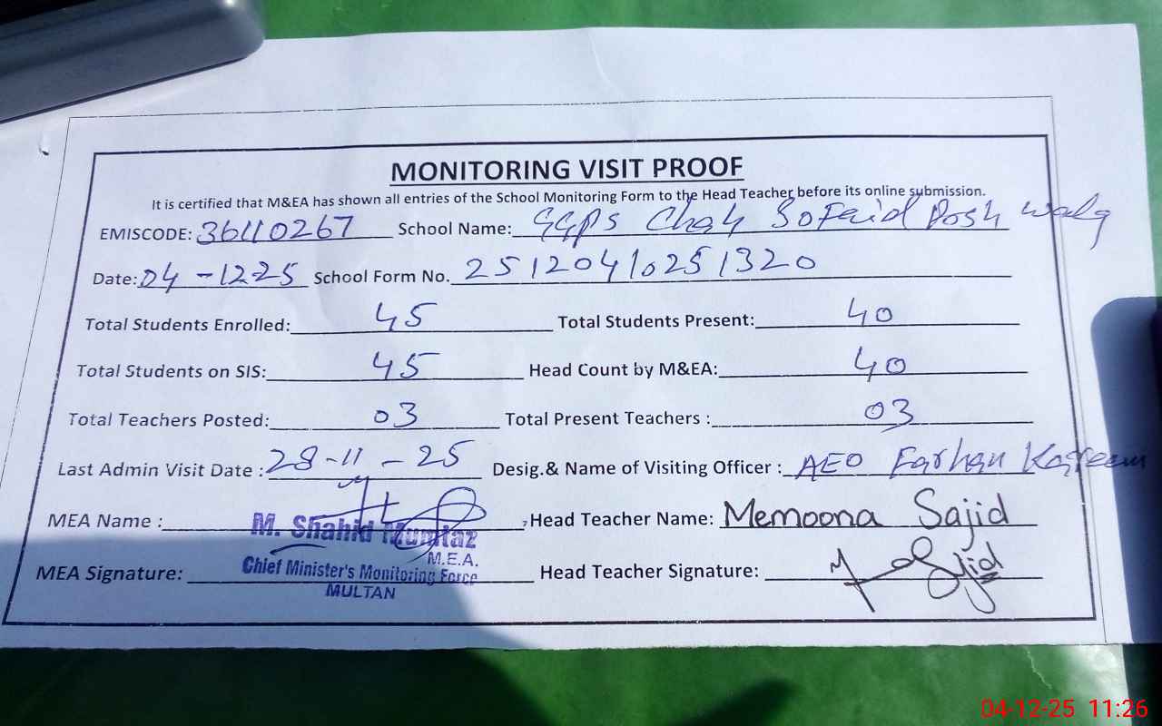 | EMIS Code: 36110267 | Name of School: GGPS CHAH SOFAID POSH VEHARI ROAD MULTAN | |||