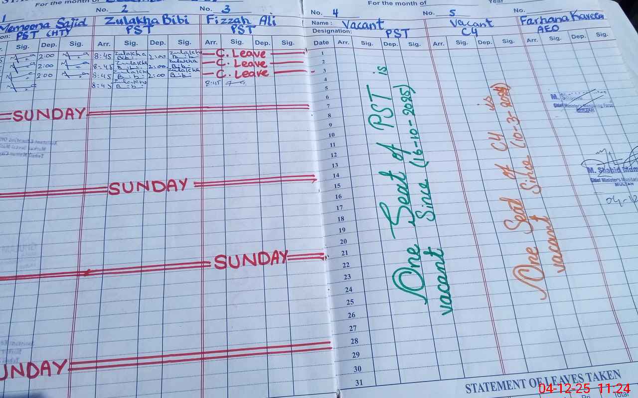 | CNIC | Full Name | Designation | R/C | Absence During Last Calender Month |