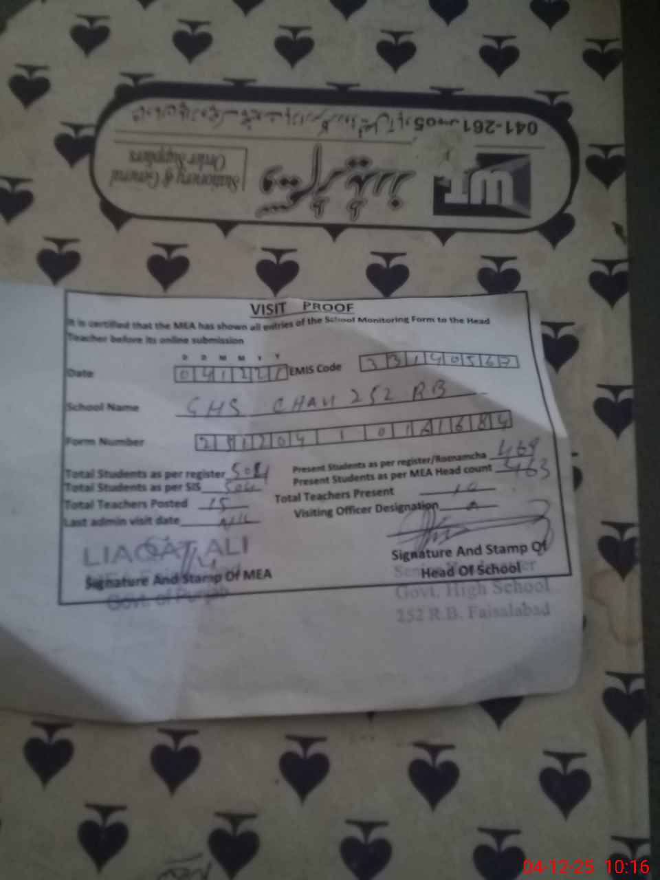 | EMIS Code: 33140567 | Name of School: GHS CHAK 252 RB FSD | |||