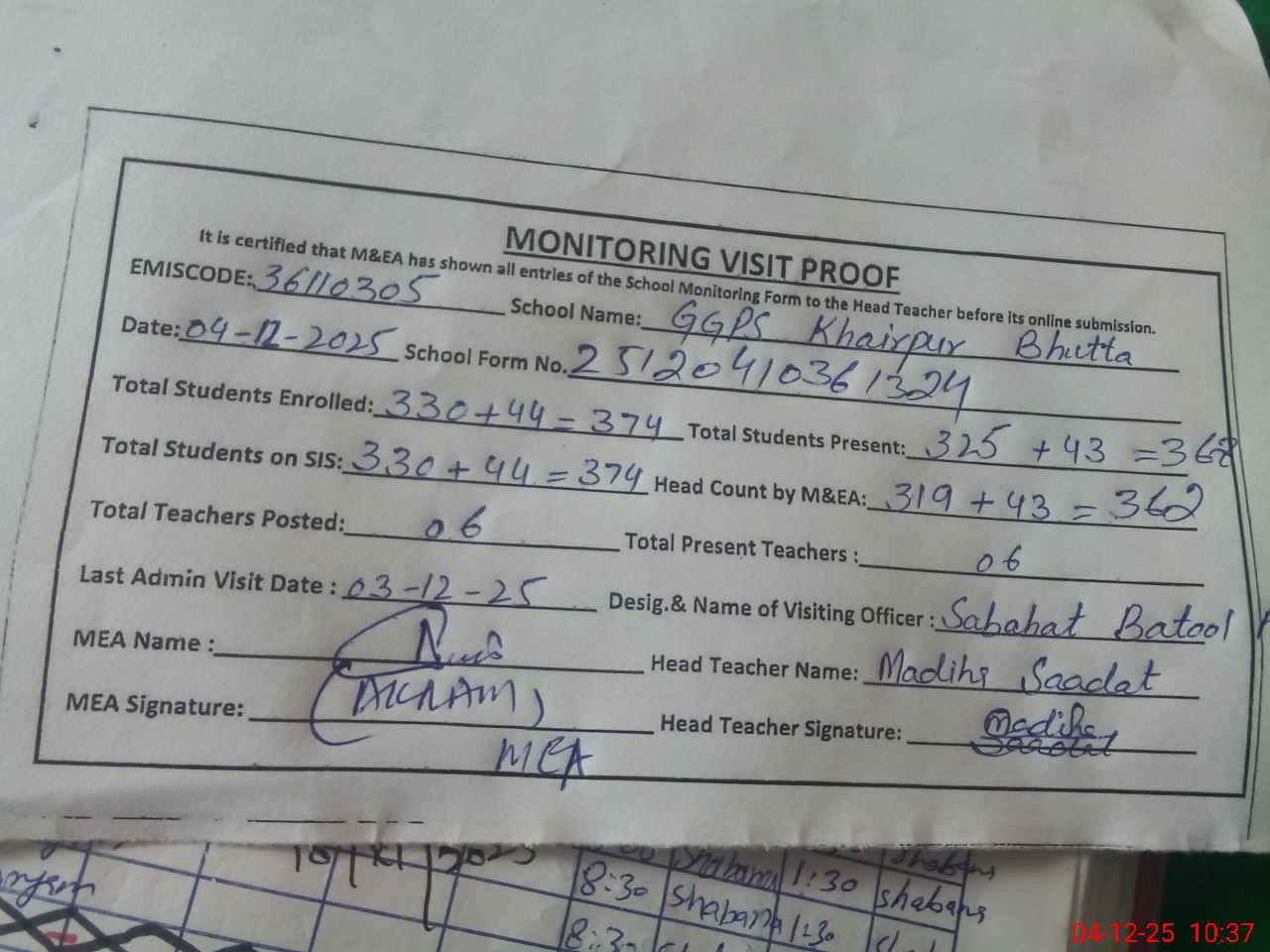 | EMIS Code: 36110305 | Name of School: GGPS KHAIR PUR BHUTTA QASIM BELA | |||