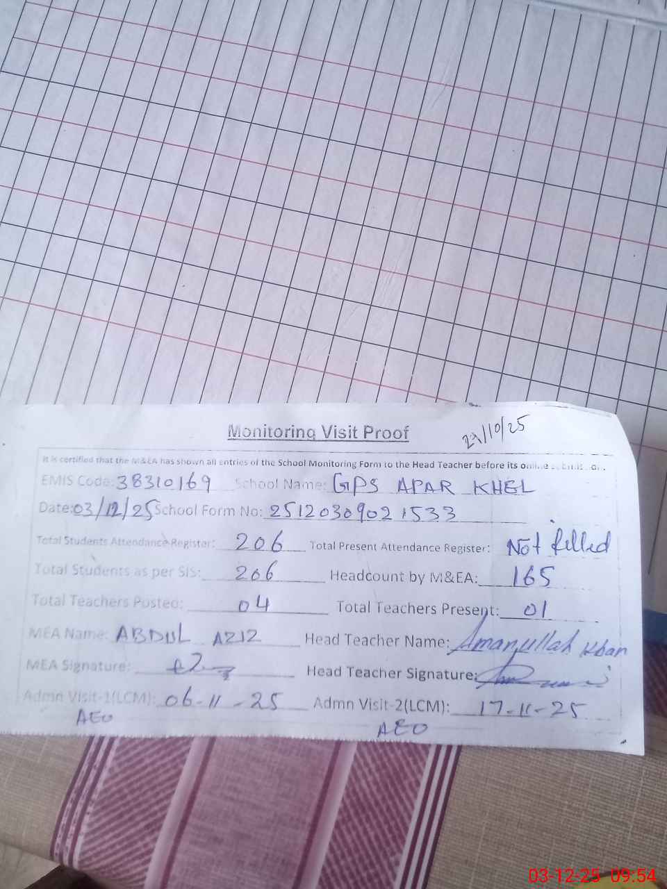 | EMIS Code: 38310169 | Name of School: GPS APAR KHEL WALA | |||