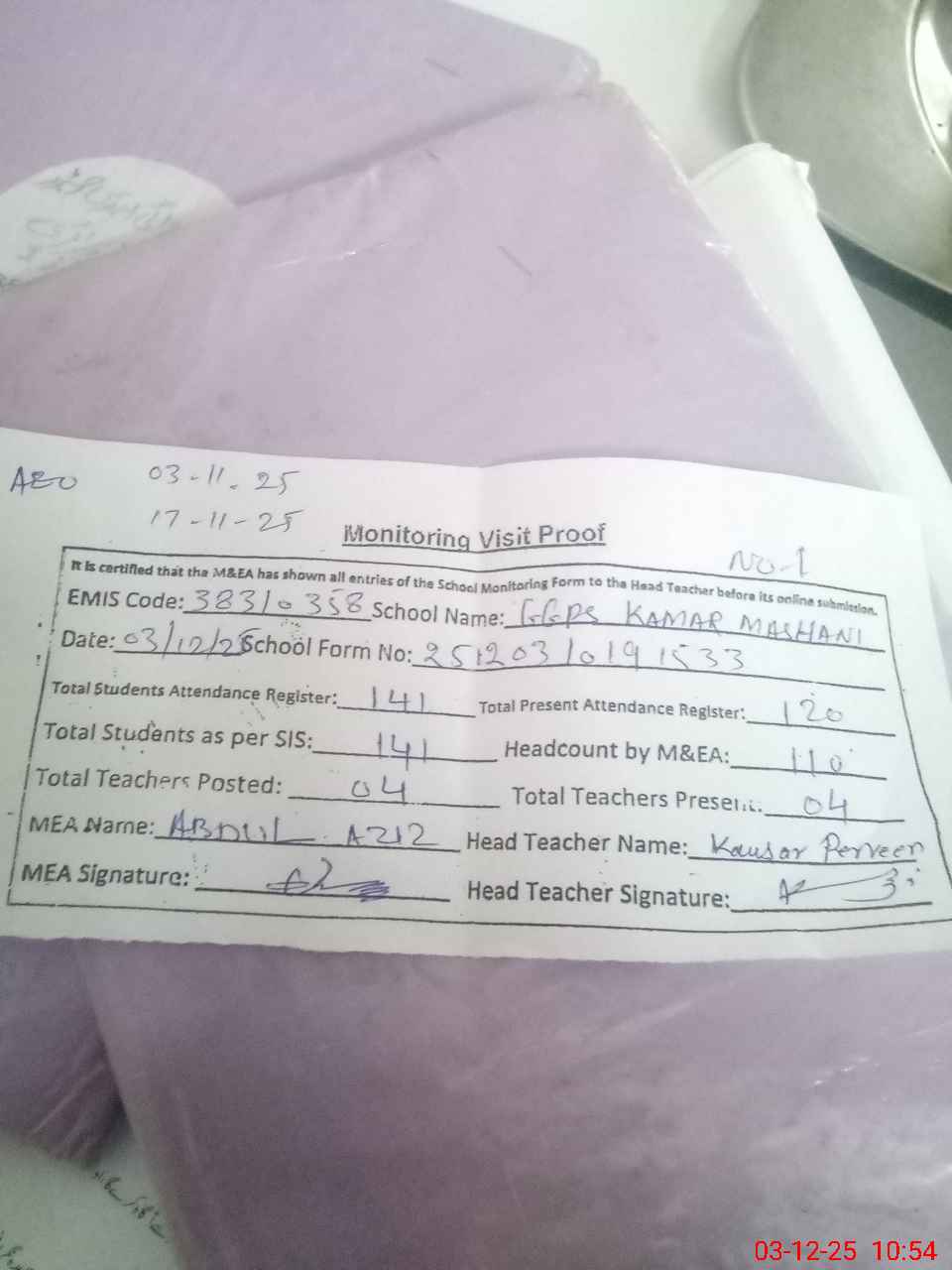 | Attendance Register | Head Teacher | MEA with School | Visit Proof |