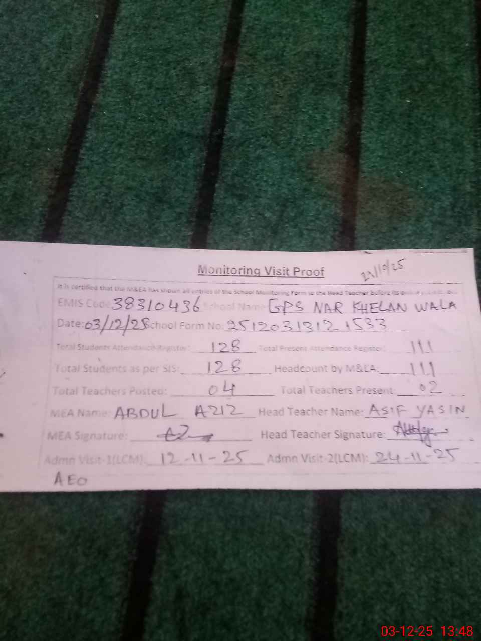 | Attendance Register | Head Teacher | MEA with School | Visit Proof |