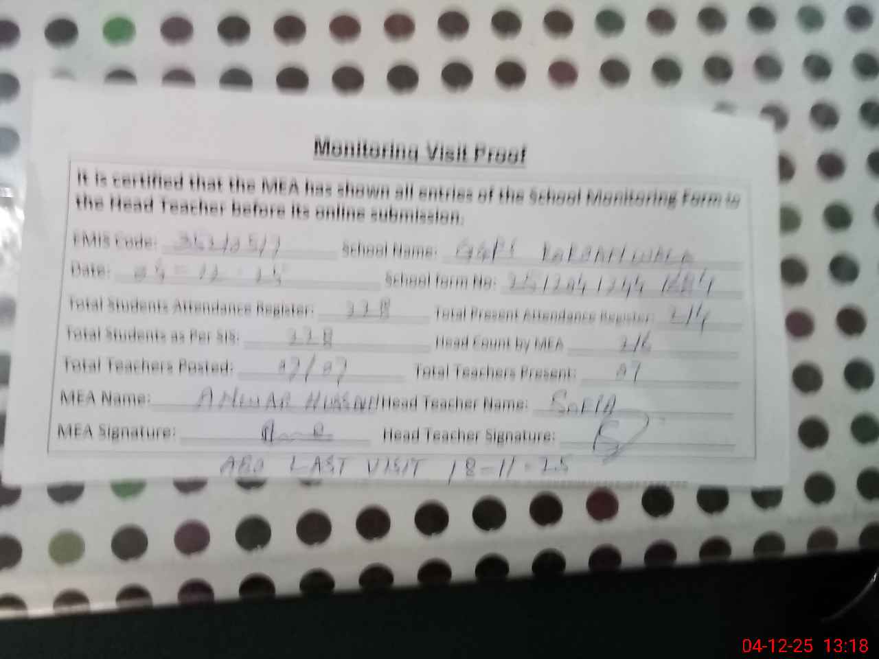 | Remarks (Use Separate Page if Required): AEO last visit on 18 November 2025 01 class Room under construction All School building required white wash 35210517 | |||||