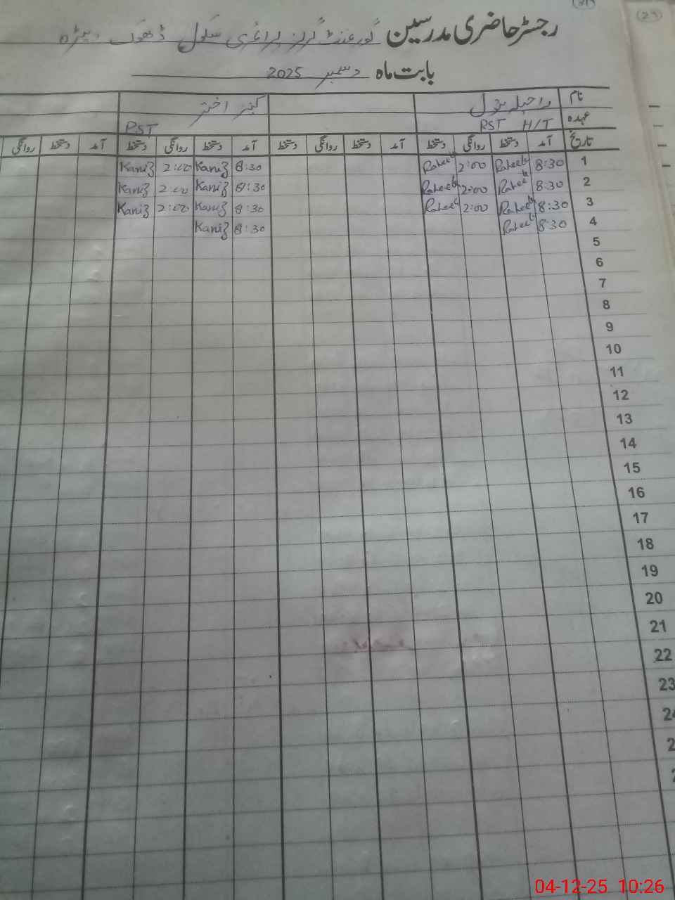 | CNIC | Full Name | Designation | R/C | Absence During Last Calender Month |