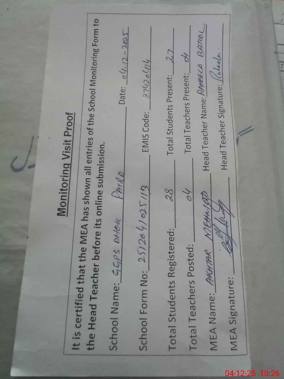 | Attendance Register | Head Teacher | MEA with School | Visit Proof |