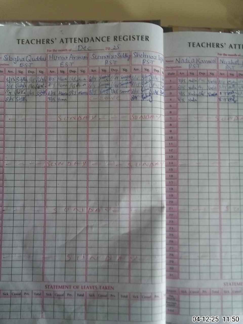 | Leave | Duty | Absent | Maternity | Medical | Ex- Pak |
