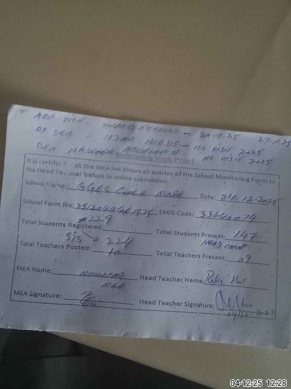 | Attendance Register | Head Teacher | MEA with School | Visit Proof |