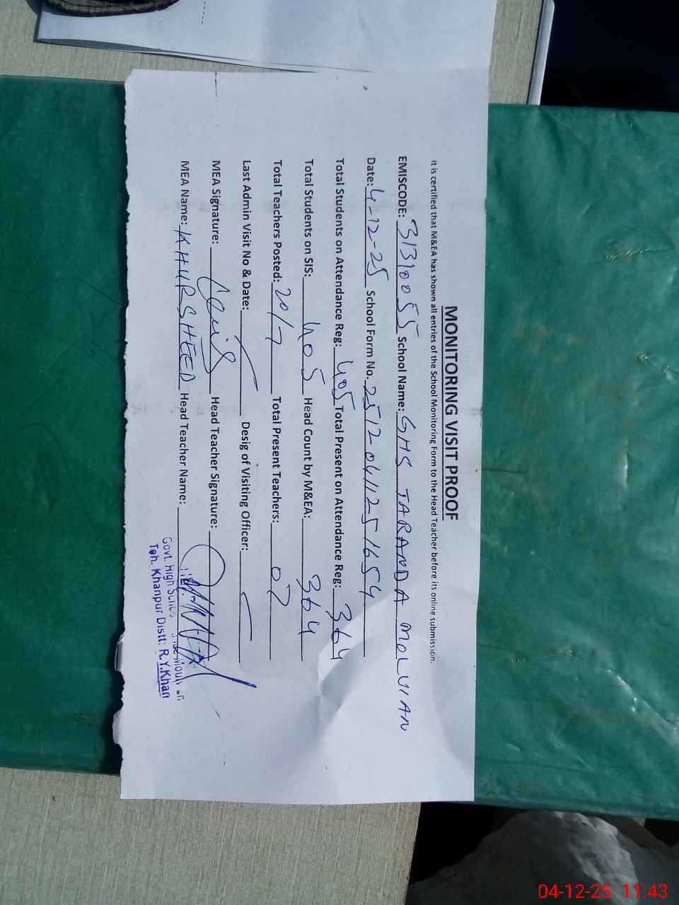 | Attendance Register | Head Teacher | MEA with School | Visit Proof |