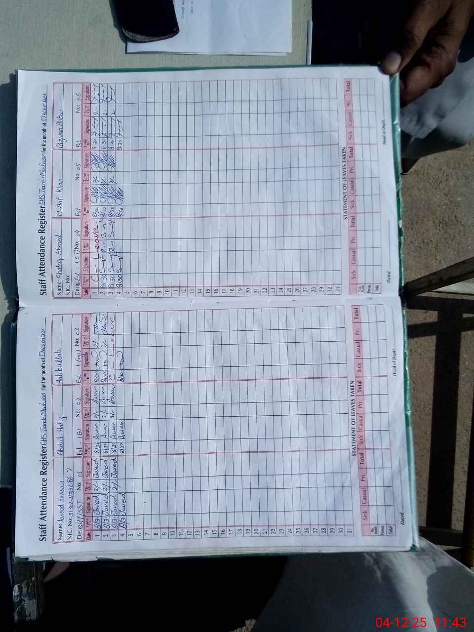 | CNIC | Full Name | Designation | R/C | Absence During Last Calender Month |