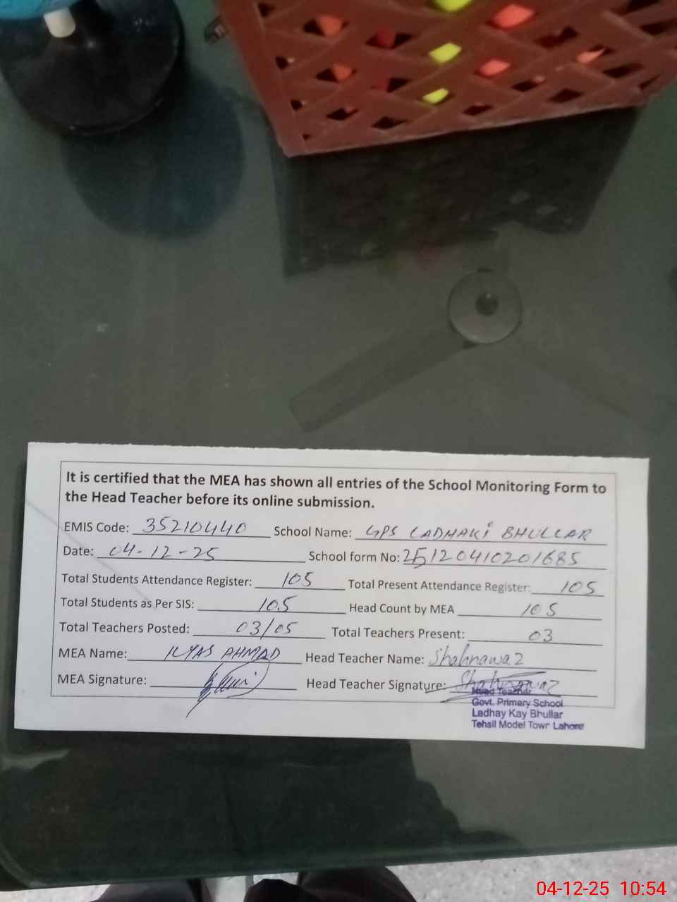 | Attendance Register | Head Teacher | MEA with School | Visit Proof |