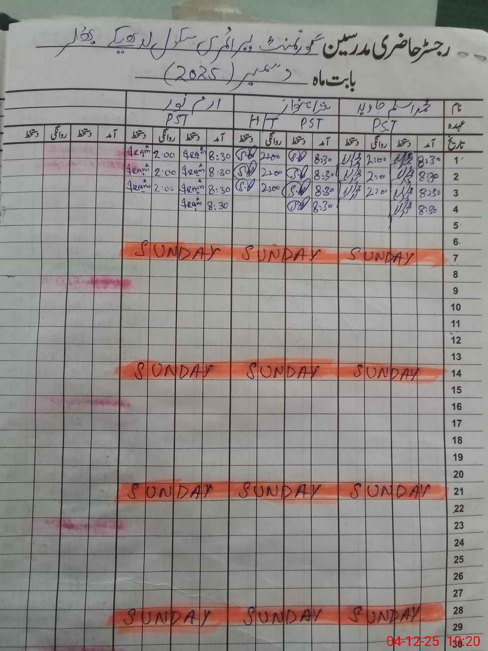 | CNIC | Full Name | Designation | R/C | Absence During Last Calender Month |
