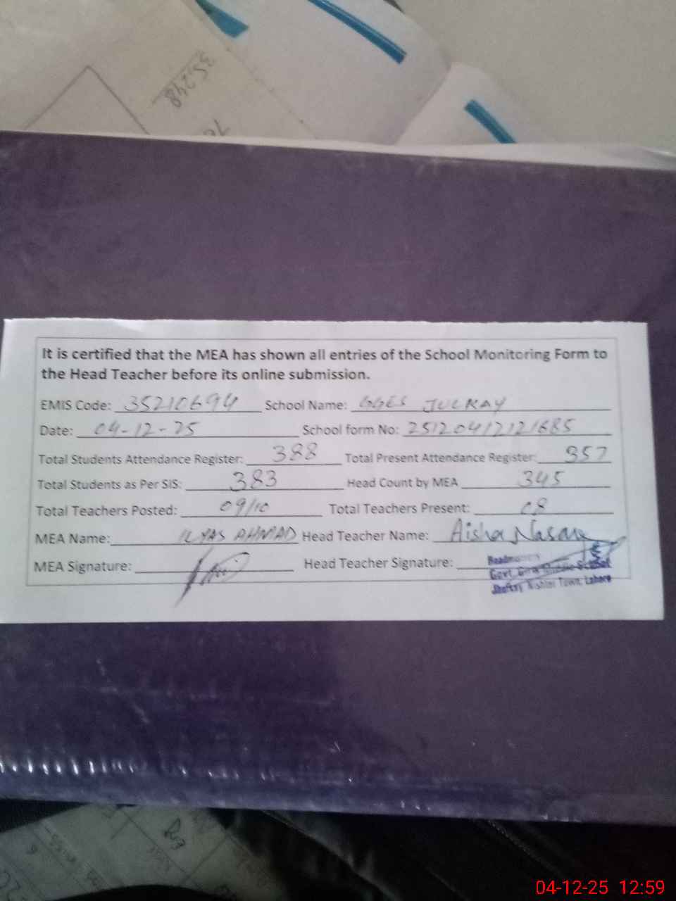 | Attendance Register | Head Teacher | MEA with School | Visit Proof |