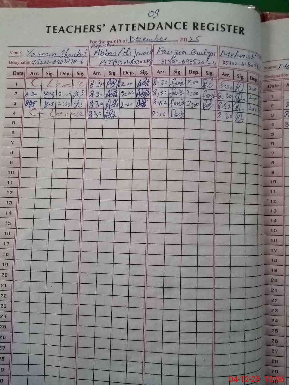 | Remarks (Use Separate Page if Required): Teacher Yasmin Shoukat PST is marked absent today as casual leave has not been approved so far Teacher Bilal Shoukat PST is marked absent today as He was not available in School when I entered the School after about 15 minutes He came back in School probably on call All rooms and Corridor floor are damaged uneven surface very very rough also building having cracks in almost every room 01 Electrical board hanging in Nursery class NSB and FTF record registers are not shown FTB record is not shown Sewerage Water pond in front of the School Last AEO visit on 3 December 2025 | |||||