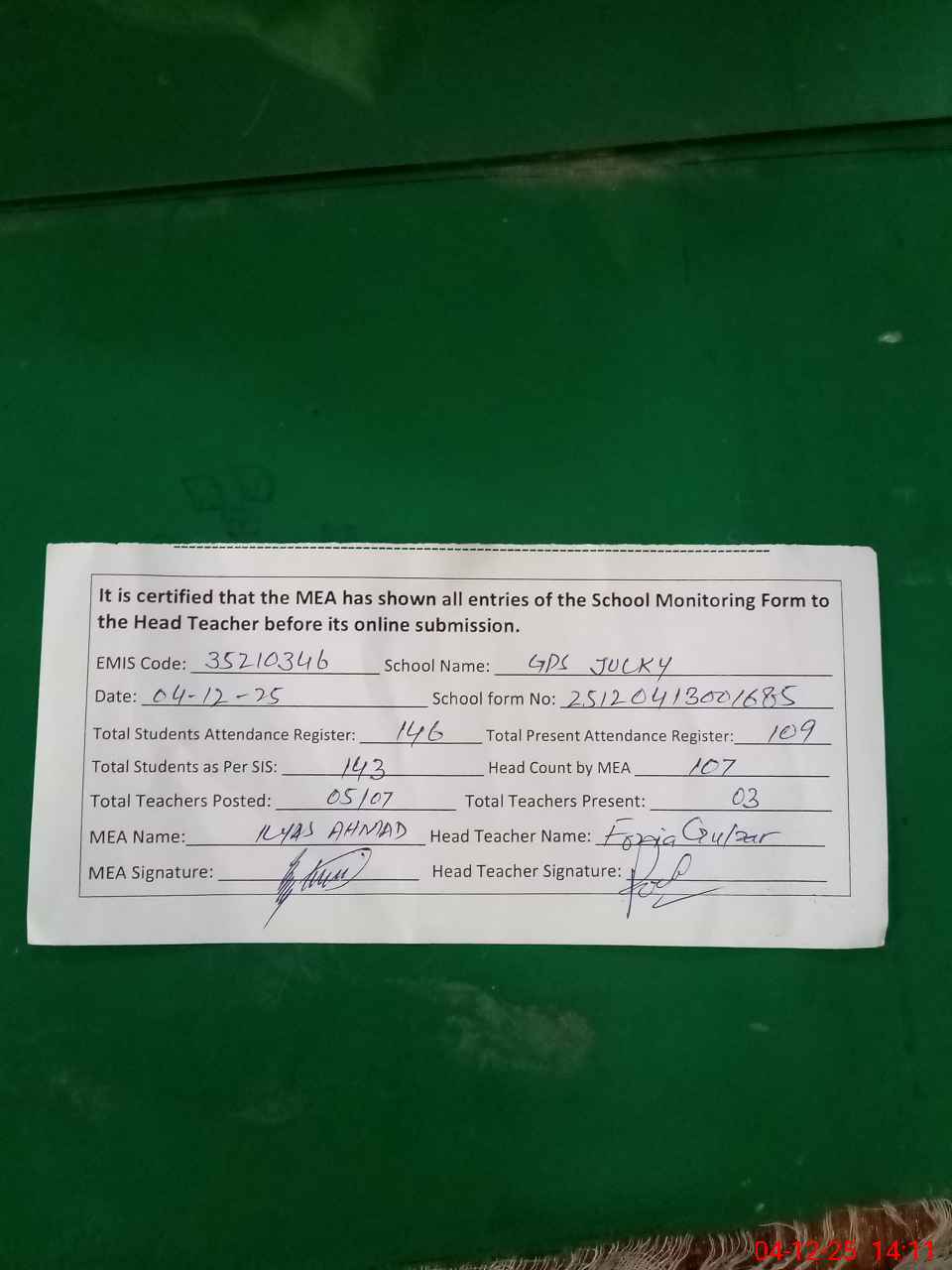 | Attendance Register | Head Teacher | MEA with School | Visit Proof |