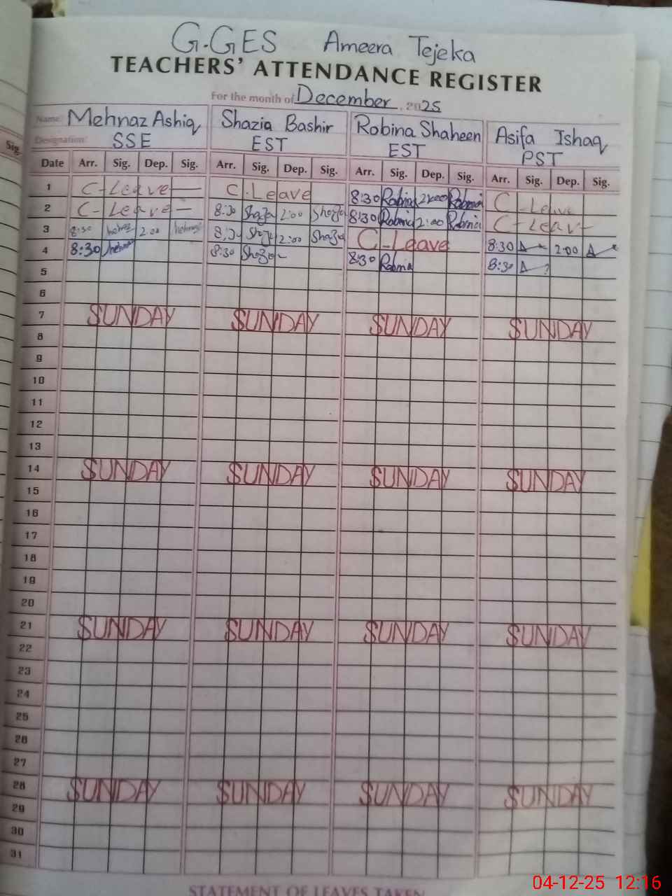 | CNIC | Full Name | Designation | R/C | Absence During Last Calender Month |